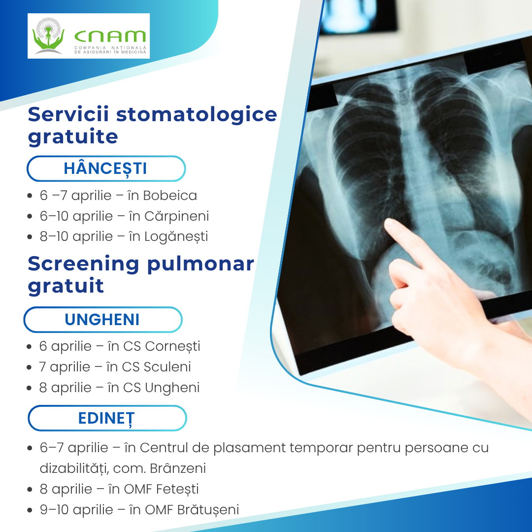 Potrivit programului stabilit, complexul radiodiagnostic mobil pentru examinarea cutiei toracice va ajunge în mai multe instituții medicale din raioanele Ungheni și Edineț. Astfel, pe 6 aprilie acesta se va afla la Centrul de Sănătate Cornești, iar pe 7 aprilie la Centrul de Sănătate Sculeni. În perioada 6–7 aprilie, investigațiile vor fi efectuate și în cadrul Centrului de Plasament Temporar pentru Persoane cu Dizabilități din comuna Brânzeni.