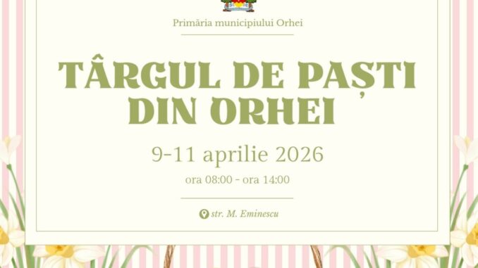 Primăria municipiului Orhei invită locuitorii și vizitatorii să participe la Târgul de Paști, care se va desfășura în perioada 9–11 aprilie 2026, între orele 08:00 și 14:00, pe strada Mihai Eminescu.