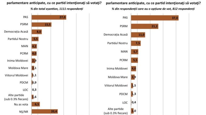 Actualul partid de guvernământ, PAS, este cotat, în momentul de față, cu 27 la sută în preferințele electorale, cu trei puncte procentuale mai puțin decât în luna februarie a acestui an, când înregistra un scor de 30% din total. Cel puțin asta arată sondajul IMAS, prezentat astăzi la Chișinău.