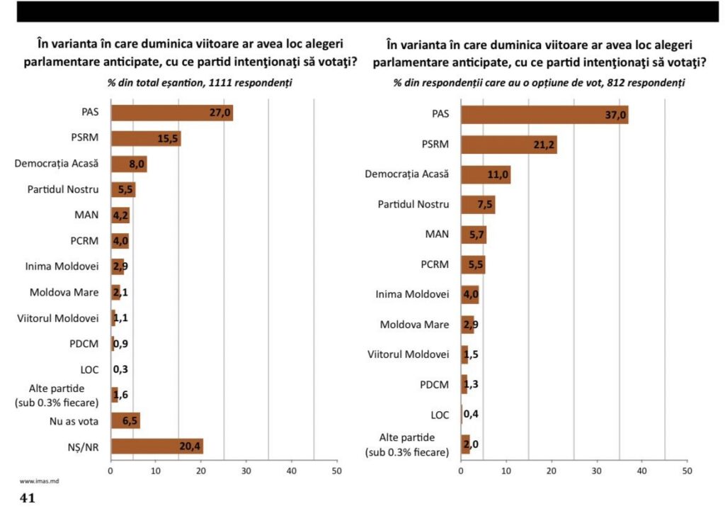 Actualul partid de guvernământ, PAS, este cotat, în momentul de față, cu 27 la sută în preferințele electorale, cu trei puncte procentuale mai puțin decât în luna februarie a acestui an, când înregistra un scor de 30% din total. Cel puțin asta arată sondajul IMAS, prezentat astăzi la Chișinău. Pe locul doi, cu 15,5 la […]